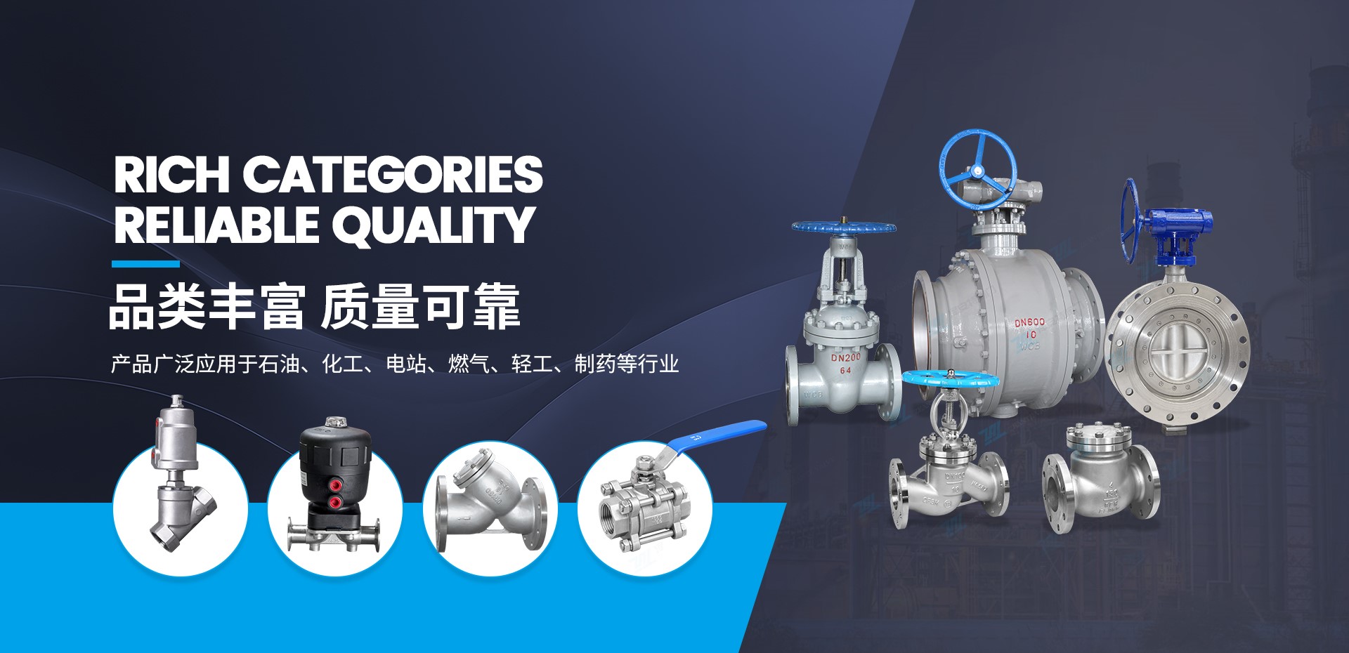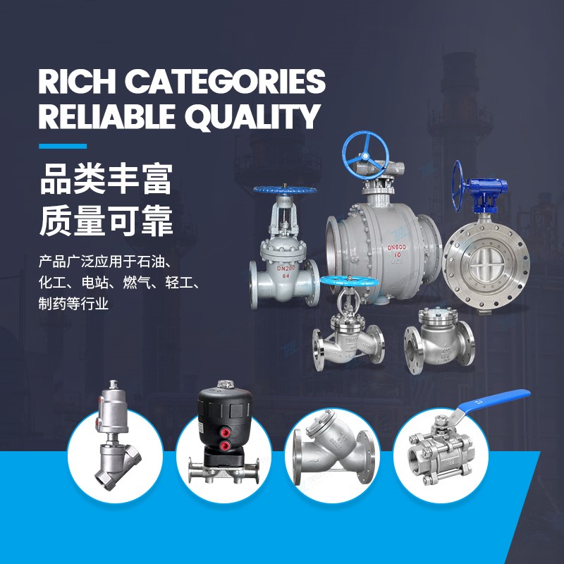 公司主要生产球阀、闸阀、截止阀、止回阀、过滤器、蝶阀、自控阀门、电动、气动系列等多元化、多标准的产品。